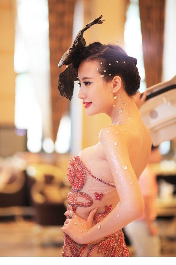 吴雨蝉身着一袭红色深V礼服,优雅侧身展现完美曲线