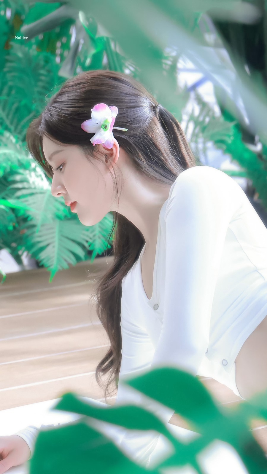 赵露思在绿植环绕的庭院中漫步,笑容清新如夏日微风